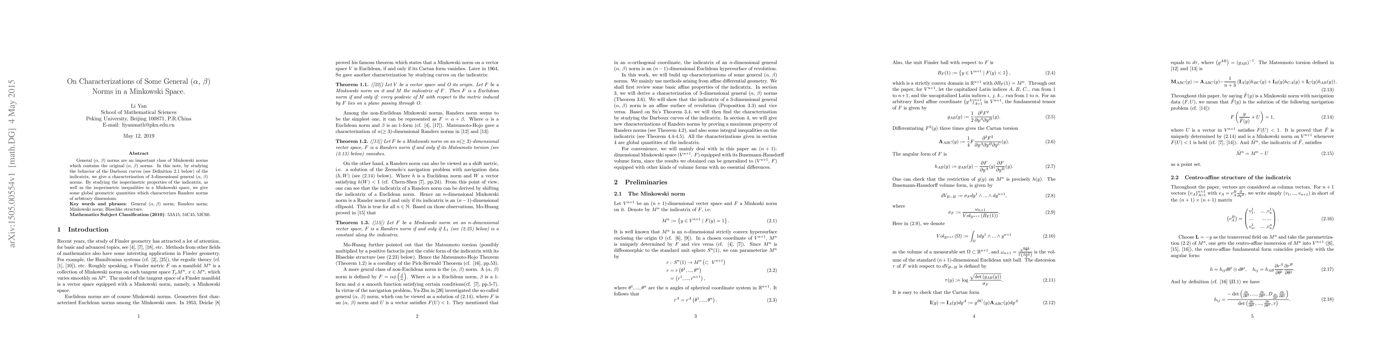General $(\alpha, \beta)$ norms are an important class of Minkowski norms which contains the original $(\alpha, \beta)$ norms. In this note, by studying the behavior of the Darboux curves of the indicatrix, we give a characterization of 3-dimensional general $(\alpha, \beta)$ norms. By studying the isoperimetric properties of the indicatrix, as well as the isoperimetric inequalities in a Minkowski space, we give some global geometric quantities which characterizes Randers norms of arbitrary dimensions.