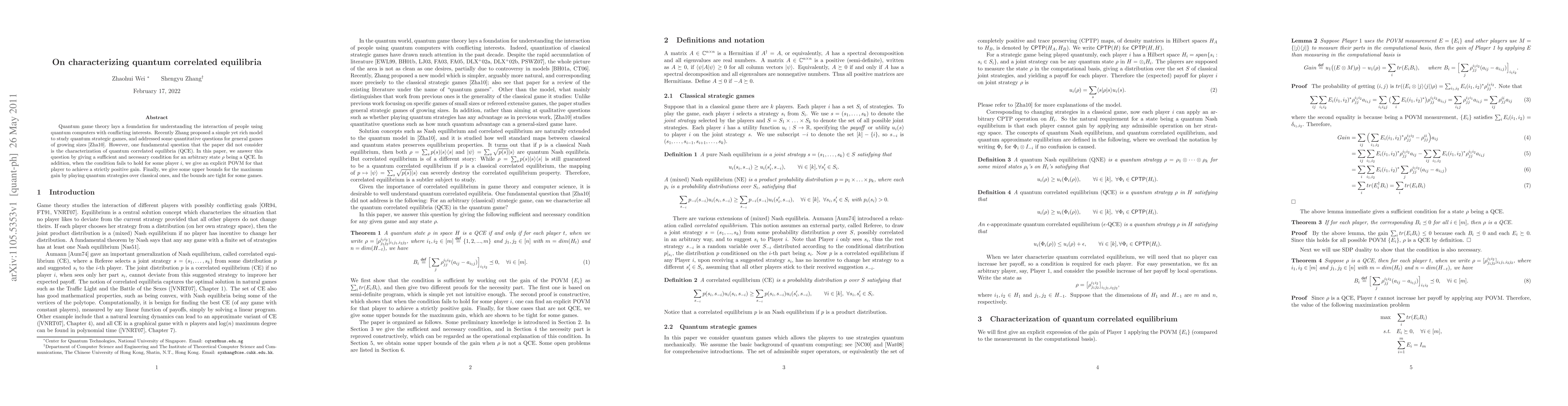 Quantum game theory lays a foundation for understanding the interaction of people using quantum computers with conflicting interests. Recently Zhang proposed a simple yet rich model to study quantum strategic games, and addressed some quantitative questions for general games of growing sizes \cite{Zha10}. However, one fundamental question that the paper did not consider is the characterization of quantum correlated equilibria (QCE). In this paper, we answer this question by giving a sufficient and necessary condition for an arbitrary state $\rho$ being a QCE. In addition, when the condition fails to hold for some player $i$, we give an explicit POVM for that player to achieve a strictly positive gain. Finally, we give some upper bounds for the maximum gain by playing quantum strategies over classical ones, and the bounds are tight for some games.