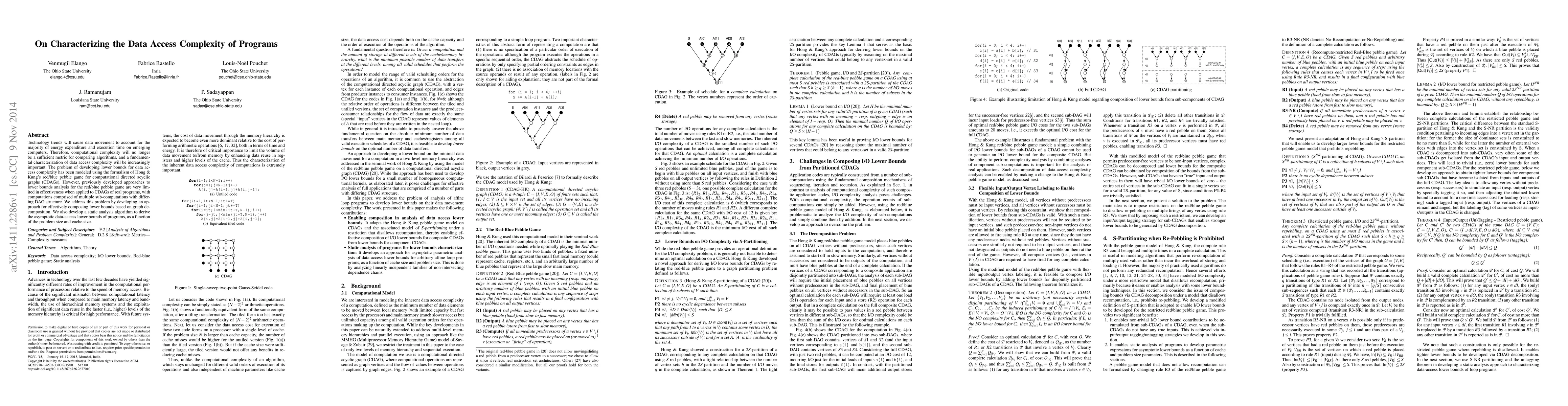 This paper proposes a new method for characterizing data access complexity in programs, emphasizing its importance due to increasing energy costs from data movement. It introduces a static analysis algorithm to derive lower bounds for data access complexity based on graph decomposition and cache size, addressing the limitations of existing methods for computational directed acyclic graphs.