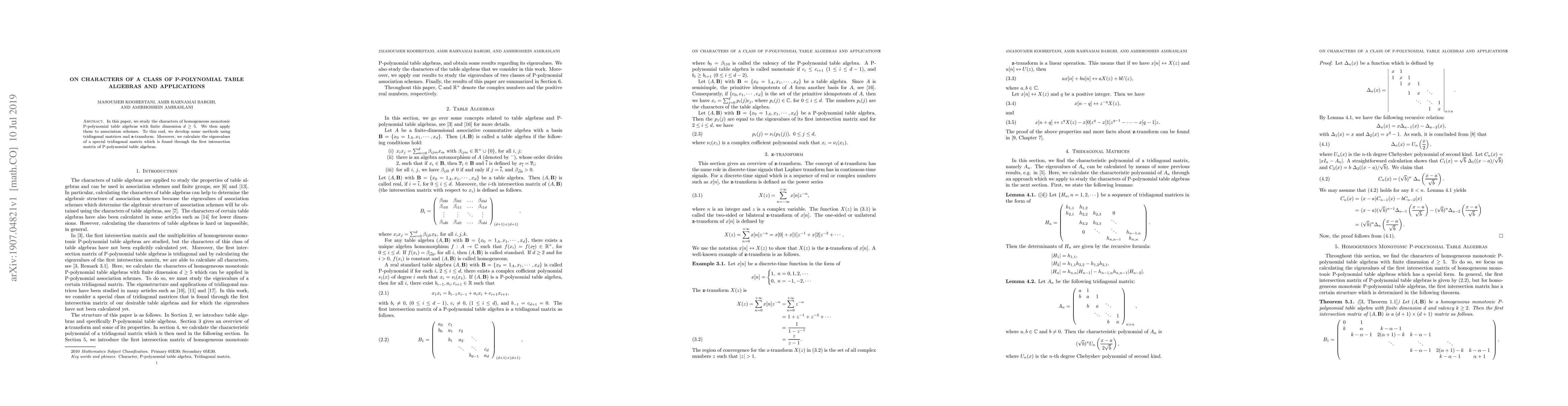 This paper investigates the characters of homogeneous monotonic P-polynomial table algebras with finite dimension d>=5, employing methods involving tridiagonal matrices and Z-transform. It applies these findings to association schemes and calculates eigenvalues of a specific tridiagonal matrix derived from the first intersection matrix.