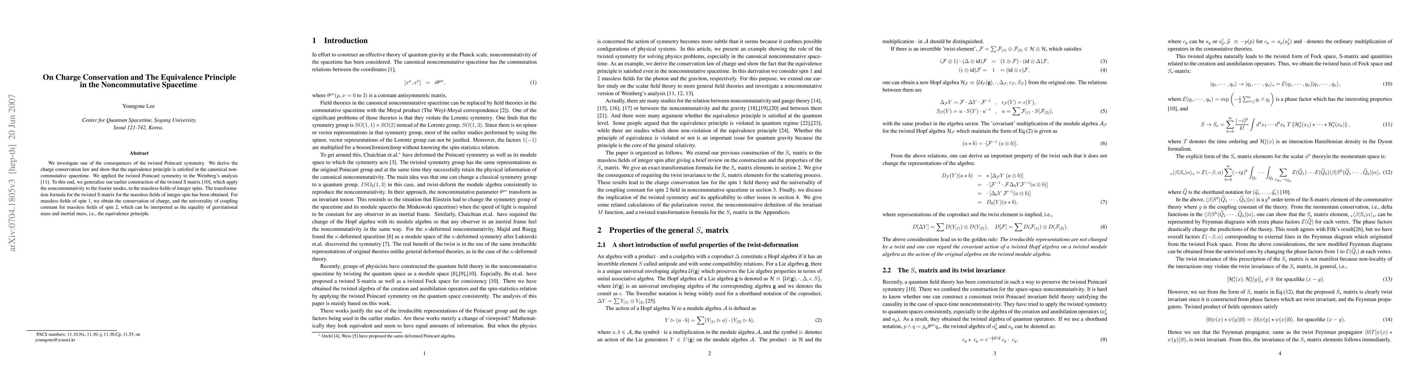 This paper explores the implications of twisted Poincaré symmetry in noncommutative spacetime, deriving charge conservation laws and demonstrating the satisfaction of the equivalence principle. It generalizes the twisted S matrix to massless fields of integer spins, achieving conservation of charge for spin 1 fields and equivalence of gravitational and inertial mass for spin 2 fields.