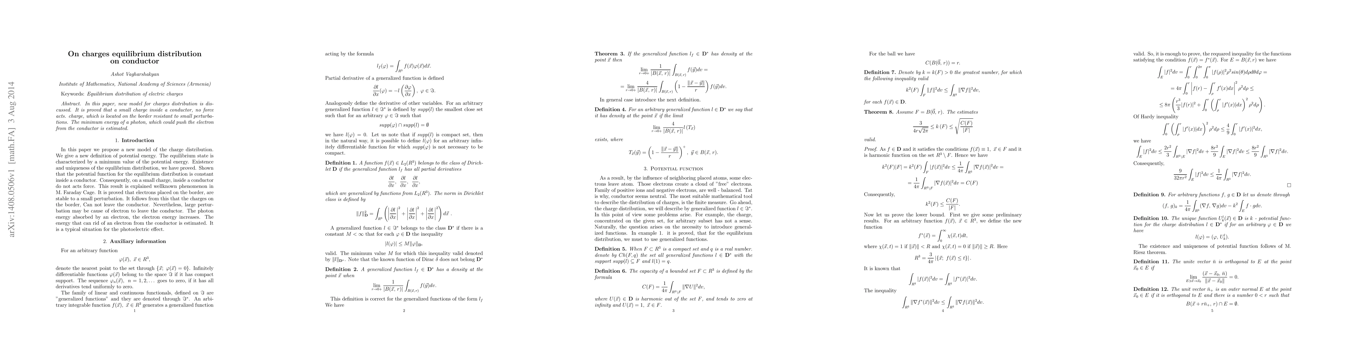 In this paper, new model for charges distribution is discussed. It is proved that a small charge inside a conductor, no force acts. charge, which is located on the border resistant to small perturbations. The minimum energy of a photon, which could push the electron from the conductor is estimated.
