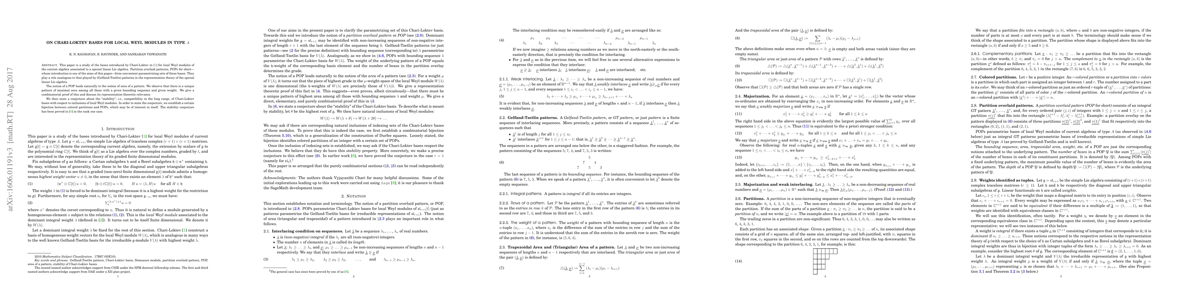 This paper is a study of the bases introduced by Chari-Loktev for local Weyl modules of the current algebra associated to a special linear Lie algebra. Partition overlaid patterns, POPs for short---whose introduction is one of the aims of this paper---form convenient parametrizing sets of these bases. They play a role analogous to that played by (Gelfand-Tsetlin) patterns in the representation theory of the special linear Lie algebra. The notion of a POP leads naturally to the notion of area of a pattern. We observe that there is a unique pattern of maximal area among all those with a given bounding sequence and given weight. We give a combinatorial proof of this and discuss its representation theoretic relevance. We then state a conjecture about the "stability", i.e., compatibility in the long range, of Chari-Loktev bases with respect to inclusions of local Weyl modules. In order to state the conjecture, we establish a certain bijection between colored partitions and POPs, which may be of interest in itself.