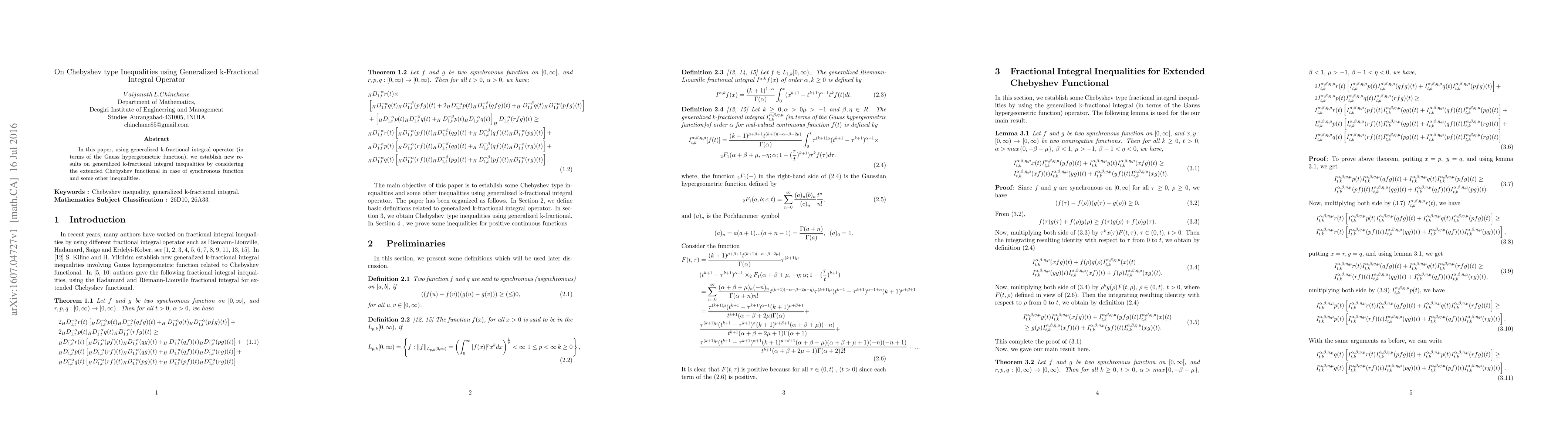 Summary: This paper introduces generalized k-fractional integral operators based on the Gauss hypergeometric function to derive new inequalities, including extended Chebyshev functional inequalities for synchronous functions.