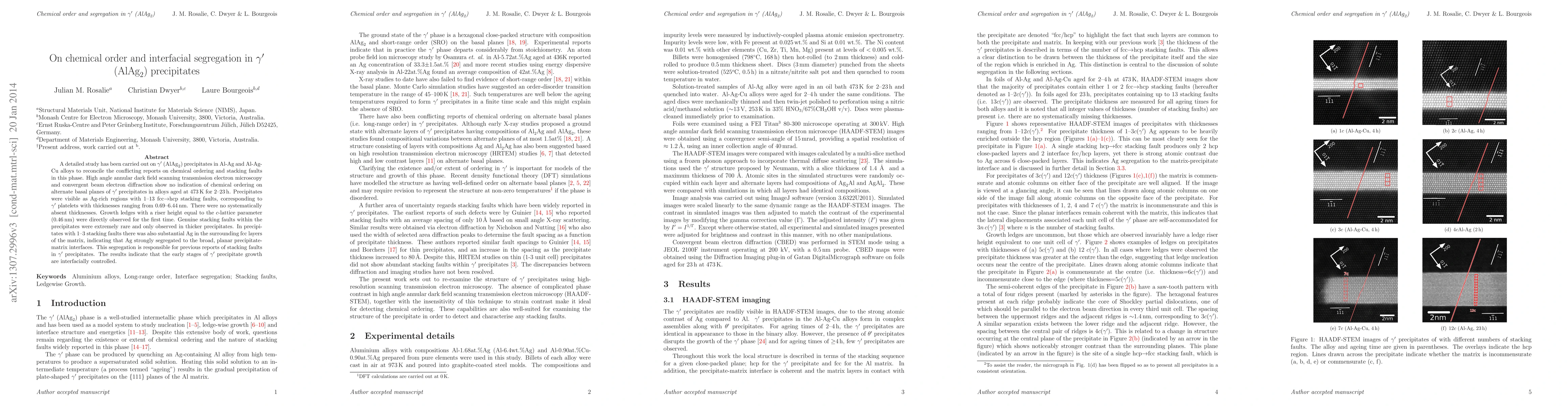 A detailed study has been carried out on $\gamma^\prime$ (AlAg$_2$) precipitates in Al-Ag and Al-Ag-Cu alloys to reconcile the conflicting reports on chemical ordering and stacking faults in this phase. High angle annular dark field scanning transmission electron microscopy and convergent beam electron diffraction show no indication of chemical ordering on alternate basal planes of $\gamma^\prime$ precipitates in alloys aged at 473 K for 2-23 h. Precipitates were visible as Ag-rich regions with 1-13 fcc$\rightarrow$hcp stacking faults, corresponding to $\gamma^\prime$ platelets with thicknesses ranging from 0.69-6.44 nm. There were no systematically absent thicknesses. Growth ledges with a riser height equal to the $c$-lattice parameter (0.46 nm) were directly observed for the first time. Genuine stacking faults within the precipitates were extremely rare and only observed in thicker precipitates. In precipitates with 1-3 stacking faults there was also substantial Ag in the surrounding fcc layers of the matrix, indicating that Ag strongly segregated to the broad, planar precipitate-matrix interfaces. This segregation is responsible for previous reports of stacking faults in $\gamma^\prime$ precipitates. The results indicate that the early stages of $\gamma^\prime$ precipitate growth are interfacially controlled.