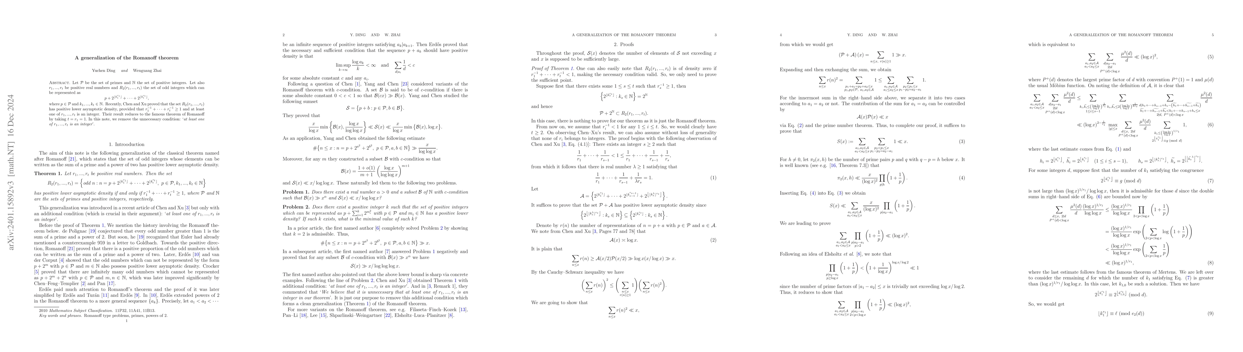 Let $\mathcal{P}$ be the set of primes and $\mathbb{N}$ the set of positive integers. Let also $r_1,...,r_t$ be positive real numbers and $R_2(r_1,...,r_t)$ the set of odd integers which can be represented as $$ p+2^{\lfloor k_1^{r_1}\rfloor}+\cdot\cdot\cdot+2^{\lfloor k_t^{r_t}\rfloor}, $$ where $p\in \mathcal{P}$ and $k_1,...,k_t\in\mathbb{N}$. Recently, Chen and Xu proved that the set $R_2(r_1,...,r_t)$ has positive lower asymptotic density, provided that $r_1^{-1}+\cdot\cdot\cdot+r_t^{-1}\ge 1$ and at least one of $r_1,...,r_t$ is an integer. Their result reduces to the famous theorem of Romanoff by taking $t=r_1=1.$ In this note, we remove the unnecessary condition that `{\it at least one of $r_1,...,r_t$ is an integer}'. The improvement benefits from a finite form of the uniform distribution type result as well as the van der Corput type bounds.
