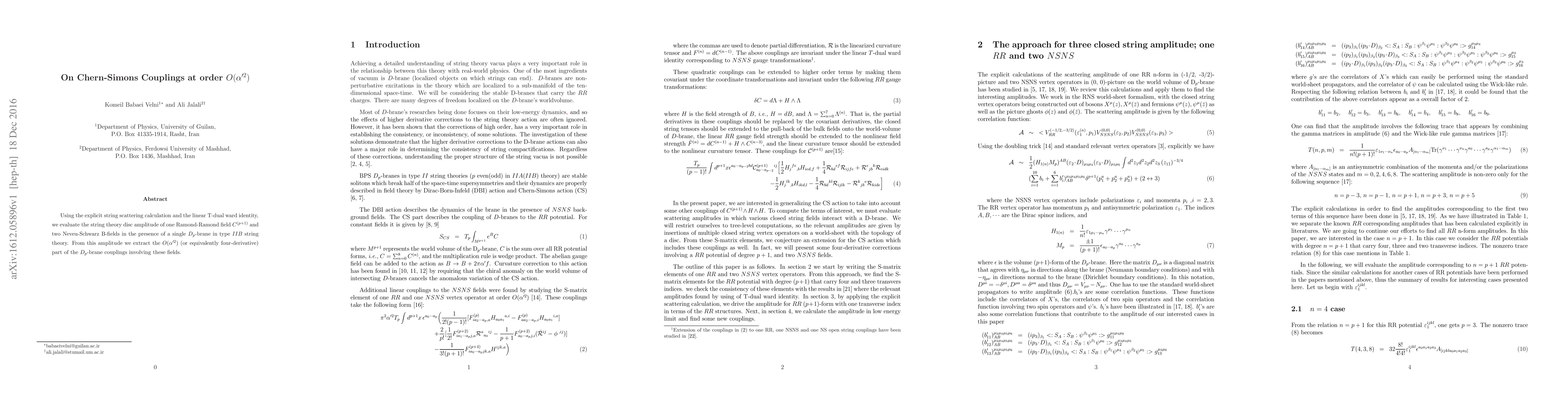 Using the explicit string scattering calculation and the linear T-dual ward identity, we evaluate the string theory disc amplitude of one Ramond-Ramond field $C^{(p+1)}$ and two Neveu-Schwarz B-fields in the presence of a single $D_p$-brane in type $IIB$ string theory. From this amplitude we extract the $O(\alpha'^2)$ (or equivalently four-derivative) part of the $D_p$-brane couplings involving these fields.