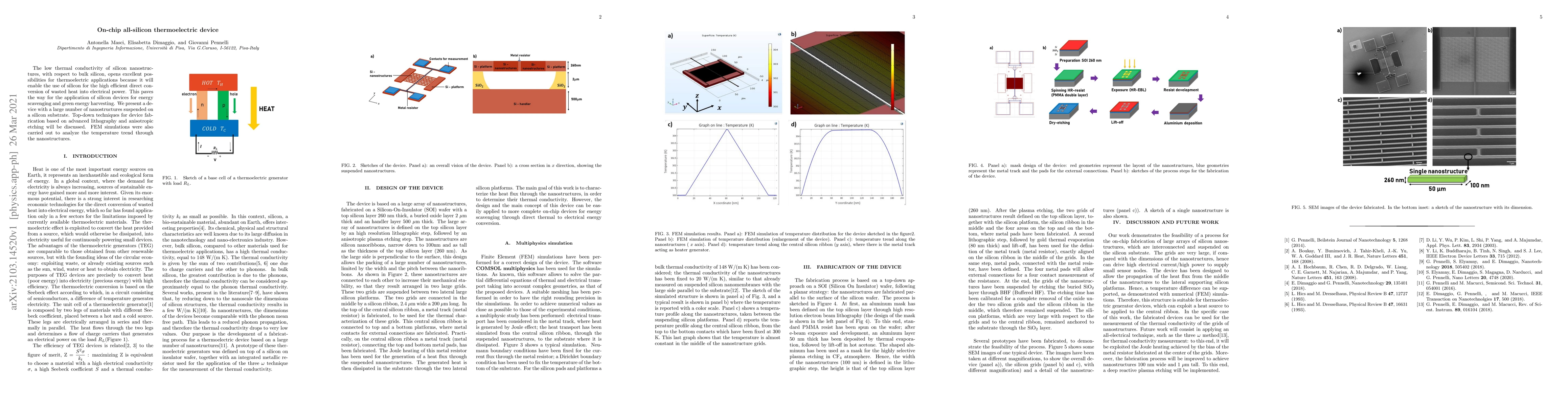 This paper explores the use of silicon nanostructures for efficient thermoelectric conversion of wasted heat into electrical power, leveraging their low thermal conductivity. The study details a fabricated on-chip all-silicon device using advanced lithography and anisotropic etching, supported by FEM simulations to analyze temperature trends.
