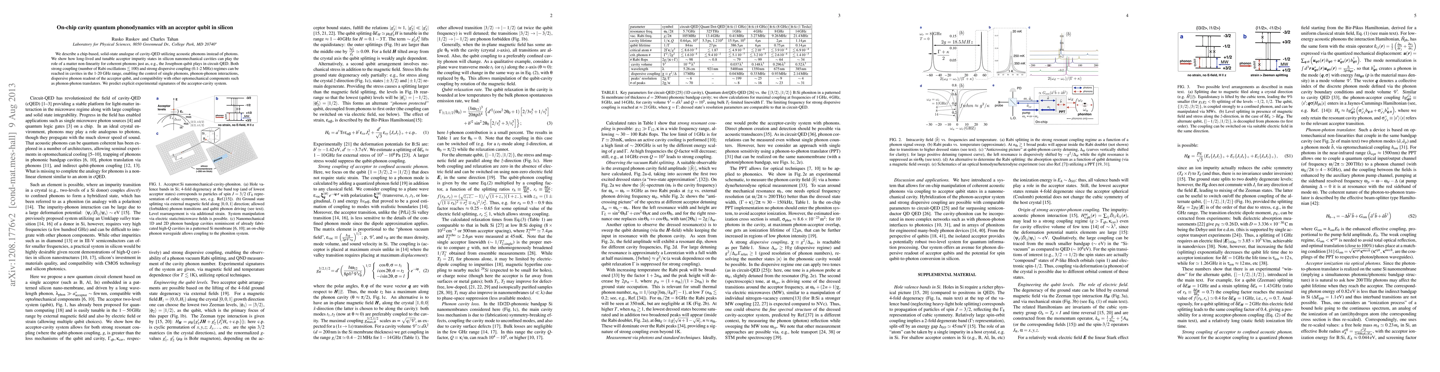 This paper presents a solid-state cavity quantum electrodynamics (QED) analogue using silicon nanomechanical cavities and acceptor impurities to control acoustic phonons. It demonstrates strong coupling and dispersive coupling regimes, enabling phonon manipulation and readout, and proposes experimental signatures for the acceptor-cavity system.