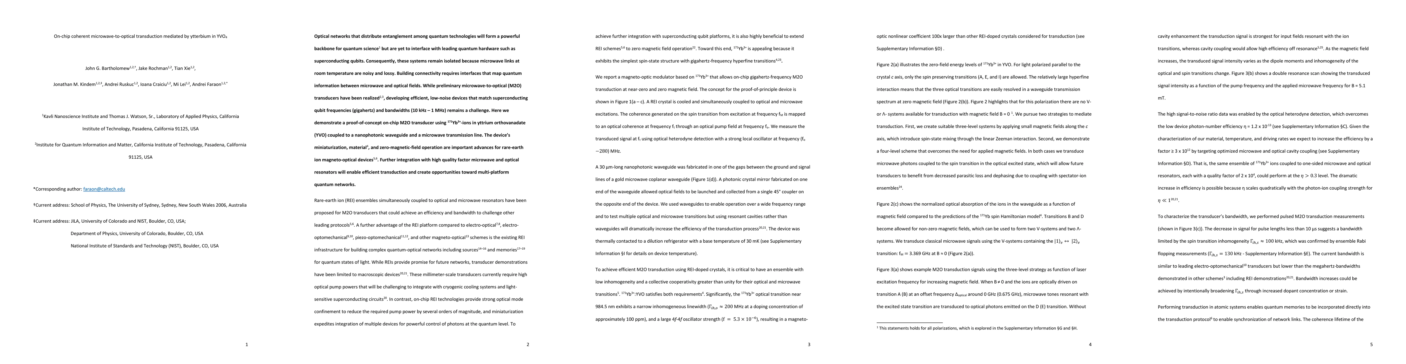 This paper presents a proof-of-concept on-chip microwave-to-optical transducer using ytterbium ions in yttrium orthovanadate, enabling efficient quantum information transfer between microwave and optical fields. The device's miniaturization and integration potential with high-quality resonators hold promise for multi-platform quantum networks.
