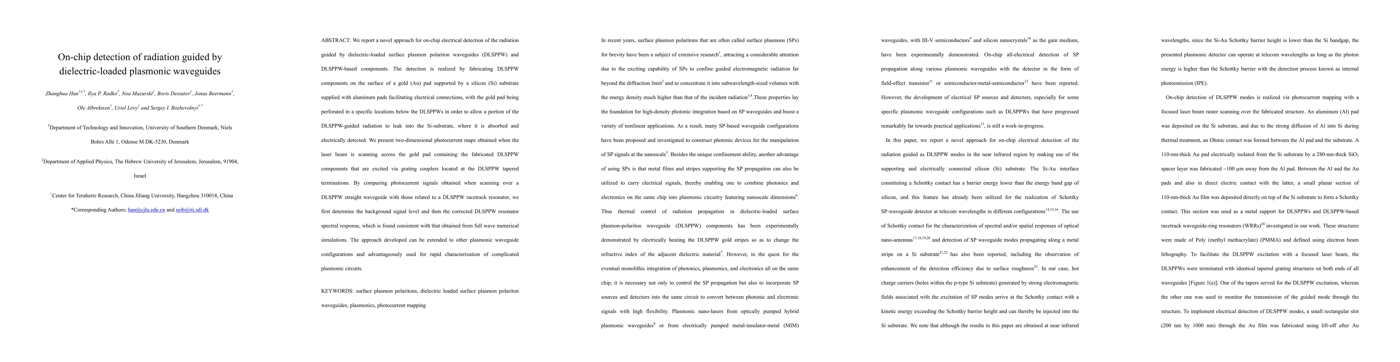 This paper introduces a novel method for on-chip electrical detection of radiation guided by dielectric-loaded surface plasmon polariton waveguides using gold pads on silicon substrates. The detection mechanism involves leakage of guided radiation into the substrate, where it is absorbed and measured, enabling characterization of plasmonic circuits.