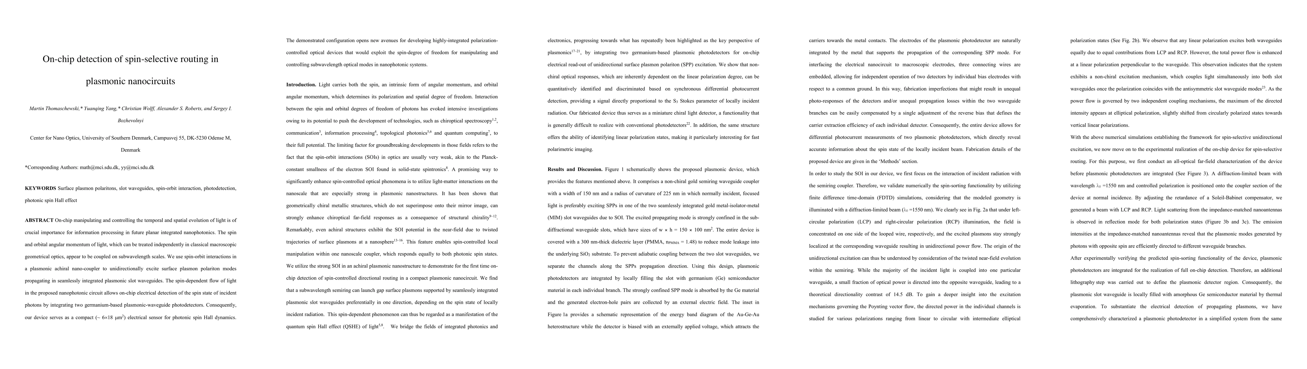 On-chip manipulating and controlling the temporal and spatial evolution of light is of crucial importance for information processing in future planar integrated nanophotonics. The spin and orbital angular momentum of light, which can be treated independently in classical macroscopic geometrical optics, appear to be coupled on subwavelength scales. We use spin-orbit interactions in a plasmonic achiral nano-coupler to unidirectionally excite surface plasmon polariton modes propagating in seamlessly integrated plasmonic slot waveguides. The spin-dependent flow of light in the proposed nanophotonic circuit allows on-chip electrical detection of the spin state of incident photons by integrating two germanium-based plasmonic-waveguide photodetectors. Consequently, our device serves as a compact ($\sim$ 6 $\times$ 18 $\mu$m$^2$) electrical sensor for photonic spin Hall dynamics. The demonstrated configuration opens new avenues for developing highly-integrated polarization-controlled optical devices that would exploit the spin-degree of freedom for manipulating and controlling subwavelength optical modes in nanophotonic systems.