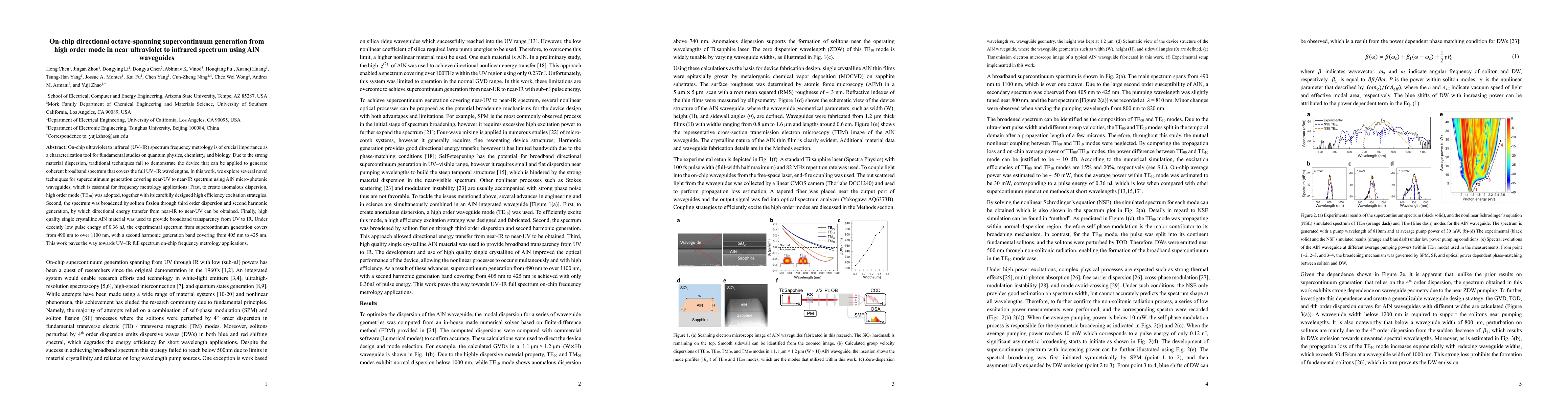 Researchers developed an on-chip system that generates a supercontinuum spanning near-UV to near-IR wavelengths using AlN waveguides, enabling frequency metrology applications.