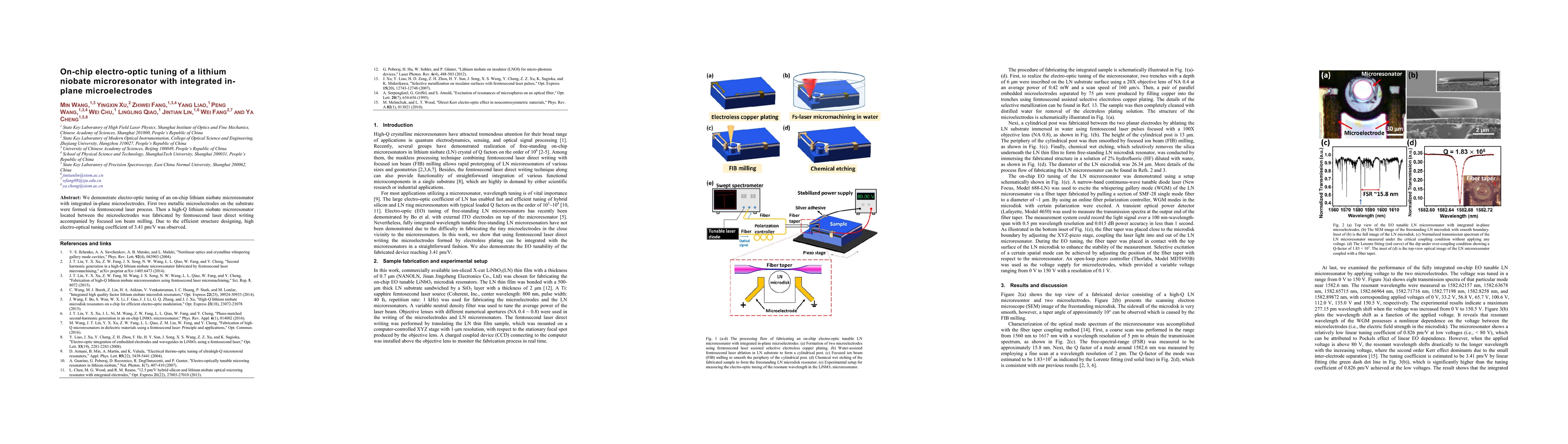 The paper demonstrates on-chip electro-optic tuning of a lithium niobate microresonator using integrated in-plane microelectrodes, achieved via femtosecond laser processing, with a high-Q factor and an electro-optical tuning coefficient of 3.41 pm/V. The efficient structure design facilitated this performance.