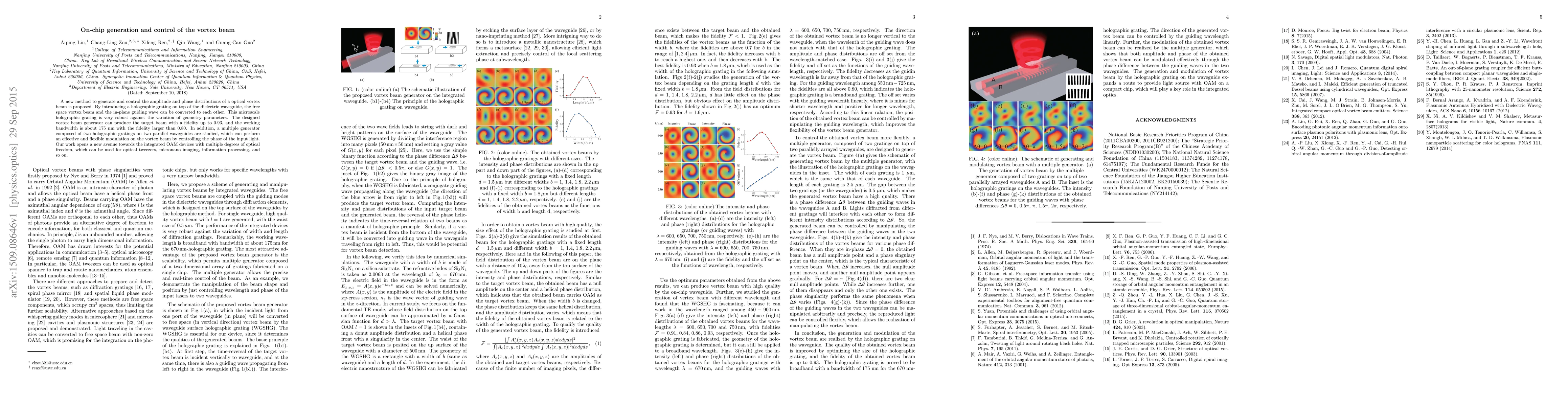 A new method to generate and control the amplitude and phase distributions of a optical vortex beam is proposed. By introducing a holographic grating on top of the dielectric waveguide, the free space vortex beam and the in-plane guiding wave can be converted to each other. This microscale holographic grating is very robust against the variation of geometry parameters. The designed vortex beam generator can produce the target beam with a fidelity up to 0.93, and the working bandwidth is about 175 nm with the fidelity larger than 0.80. In addition, a multiple generator composed of two holographic gratings on two parallel waveguides are studied, which can perform an effective and flexible modulation on the vortex beam by controlling the phase of the input light. Our work opens a new avenue towards the integrated OAM devices with multiple degrees of optical freedom, which can be used for optical tweezers, micronano imaging, information processing, and so on.