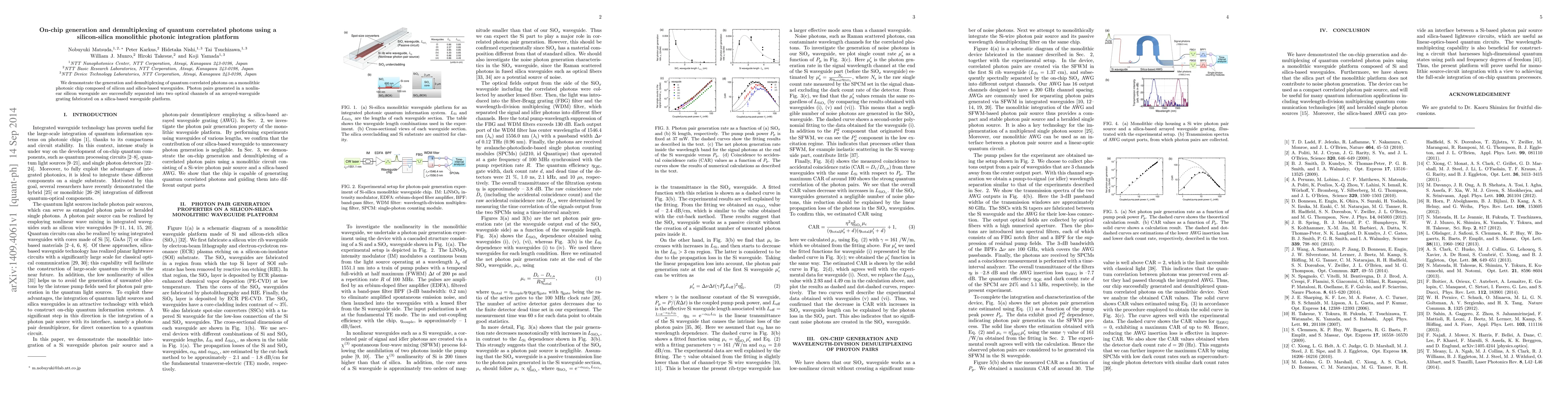 This paper presents a method for generating and demultiplexing quantum correlated photons on a silicon-silica photonic chip, utilizing an arrayed-waveguide grating for separation. The integration of silicon and silica waveguides facilitates efficient photon pair generation and routing.