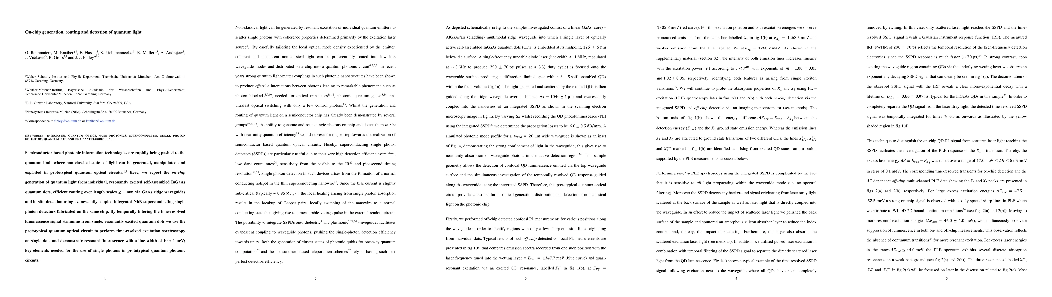 This paper reports the on-chip generation and routing of quantum light from self-assembled InGaAs quantum dots using GaAs ridge waveguides, and its detection with integrated NbN superconducting single photon detectors. The study demonstrates resonant fluorescence with a narrow linewidth, essential for quantum photonic circuits.