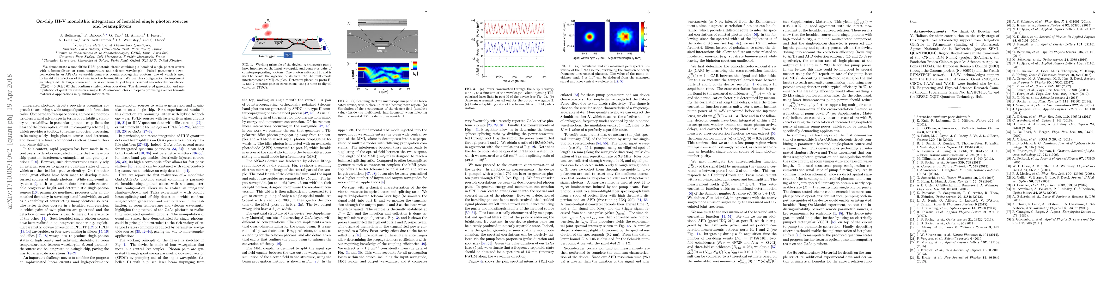 This paper presents a monolithic III-V photonic circuit integrating a heralded single photon source and a beamsplitter at room temperature and telecom wavelength. The setup confirms single-photon operation through an integrated Hanbury-Brown and Twiss experiment, paving the way for quantum information applications.