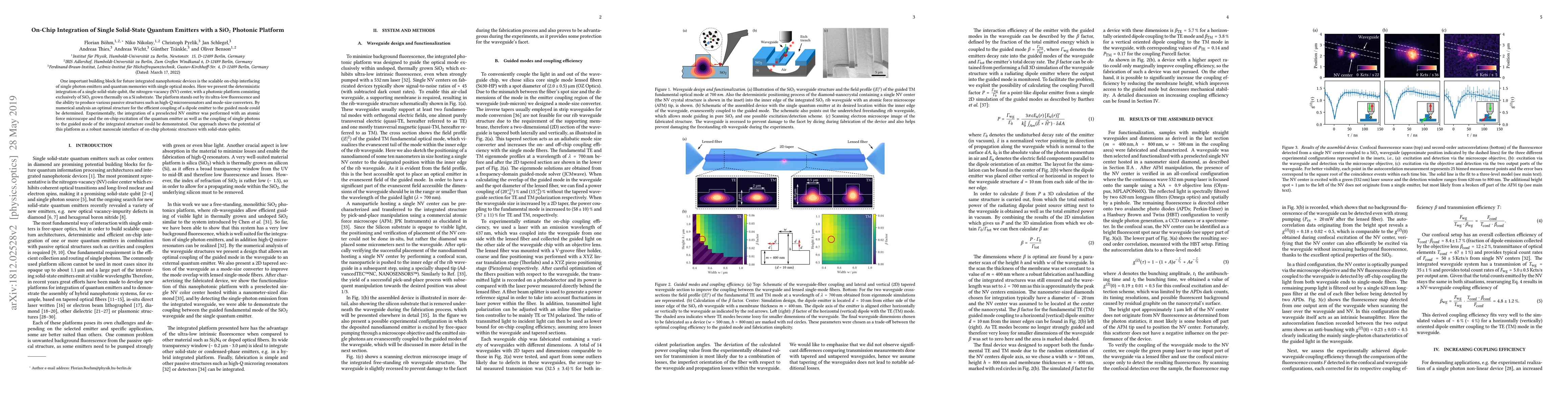 This paper details the successful on-chip integration of a nitrogen-vacancy (NV) center qubit with a silicon dioxide photonic platform, demonstrating efficient coupling of single photons to guided modes, paving the way for scalable quantum photonic devices. The integration process uses atomic force microscopy and highlights the platform's low fluorescence and capability for complex photonic structures.