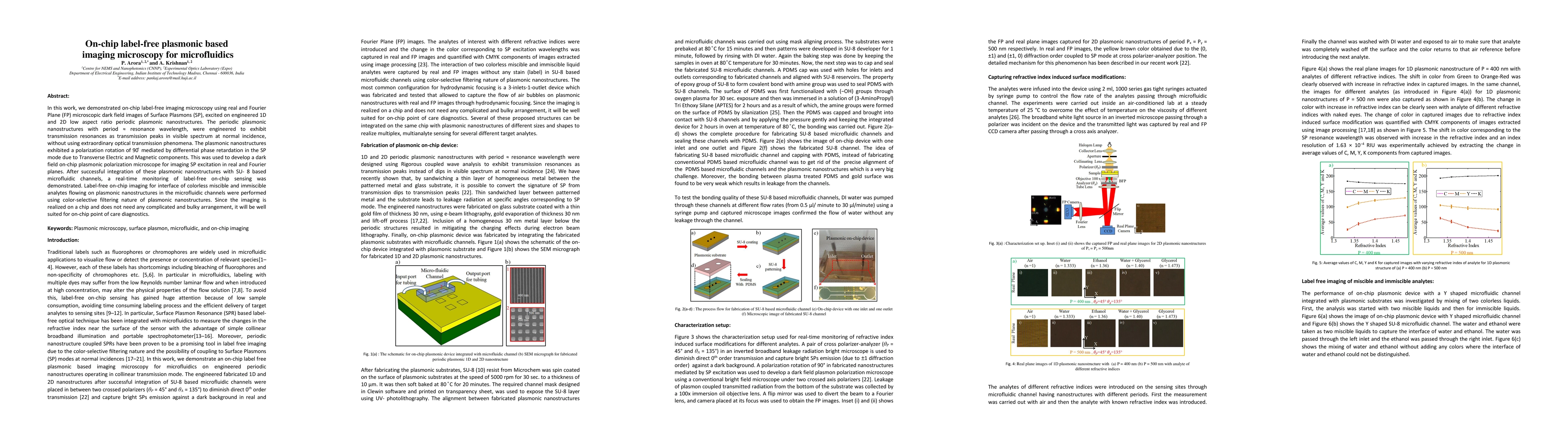 This paper presents a novel on-chip label-free imaging microscopy using plasmonic nanostructures for real-time monitoring of microfluidic systems. The engineered nanostructures enable polarization rotation and dark field imaging, facilitating label-free sensing and diagnostics without the need for complex optical setups.