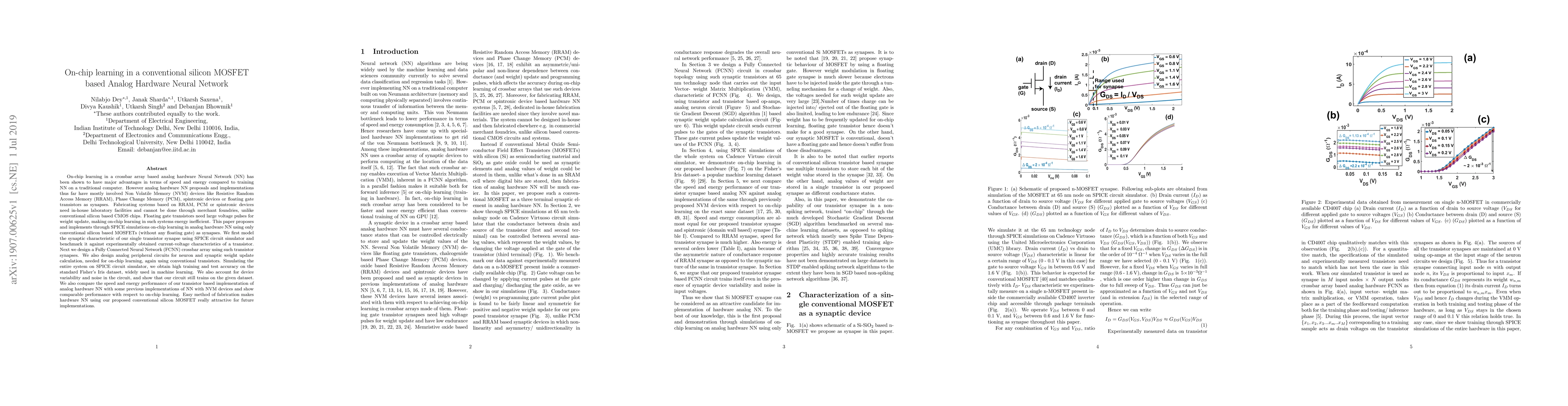 This paper proposes and simulates an on-chip learning analog hardware Neural Network using conventional silicon MOSFETs as synapses, demonstrating high accuracy and comparable speed and energy efficiency compared to NVM-based implementations. The study highlights the feasibility of using standard CMOS technology for efficient on-chip learning in neural networks.