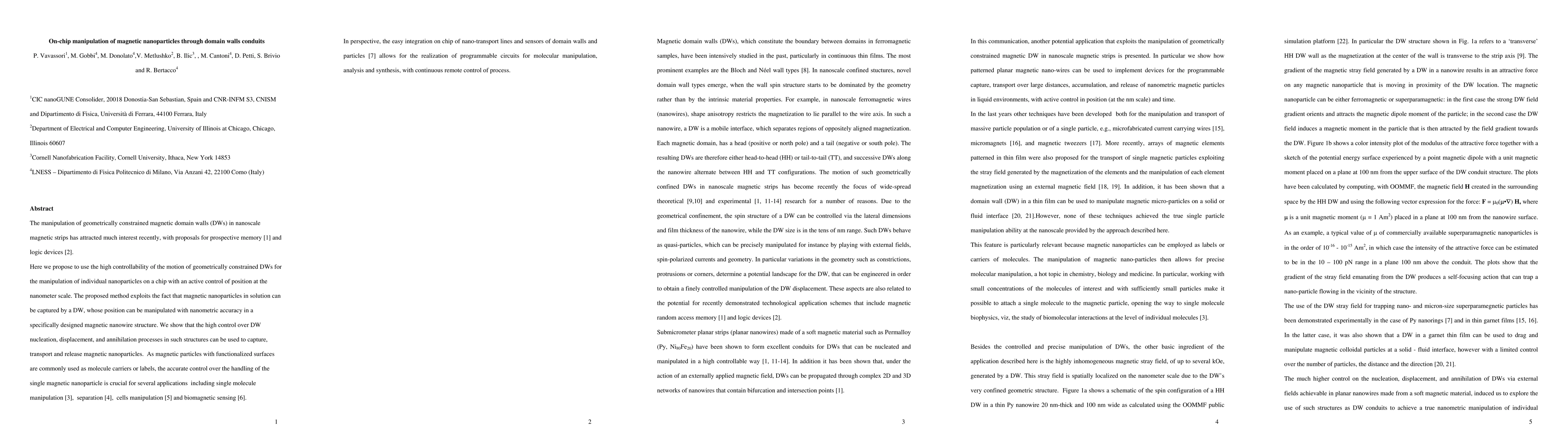 Researchers propose a method to manipulate individual magnetic nanoparticles on a chip using domain walls, enabling precise control over nanoparticle position and handling. This technology could enable applications such as single molecule manipulation and biomagnetic sensing.