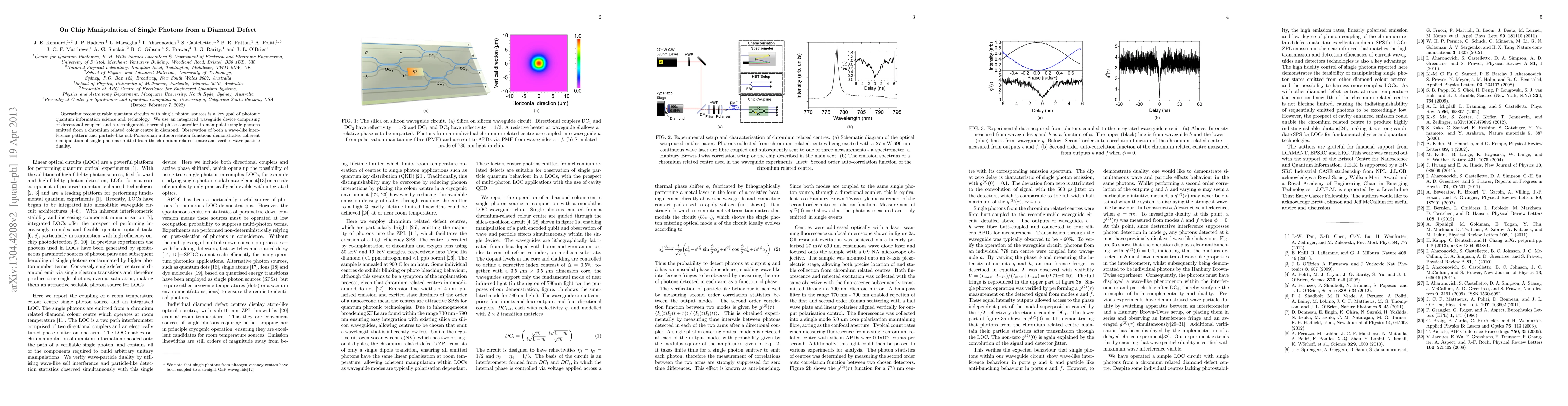 This paper details the use of an integrated waveguide device to manipulate single photons emitted from a chromium-related defect in diamond, demonstrating coherent control and verifying wave-particle duality through interference patterns and sub-Poissonian autocorrelation functions.