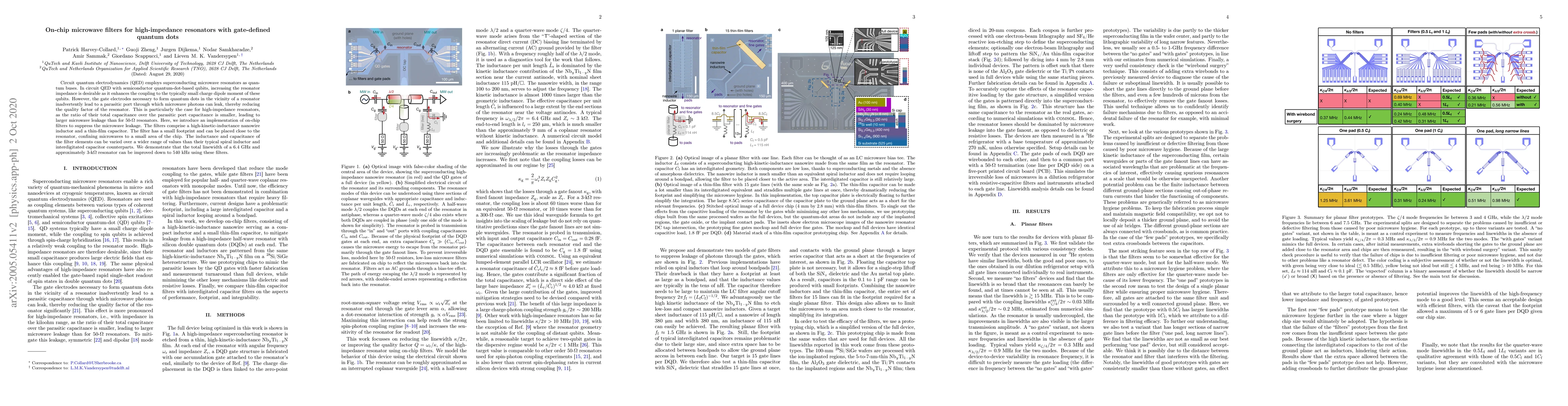 This paper presents on-chip microwave filters designed to mitigate leakage in high-impedance resonators used in circuit quantum electrodynamics with semiconductor quantum dots. The filters, composed of a high-kinetic-inductance nanowire inductor and a thin-film capacitor, significantly improve the resonator's quality factor by confining microwaves and reducing leakage, achieving a linewidth of 540 kHz for a 6.4 GHz resonator.