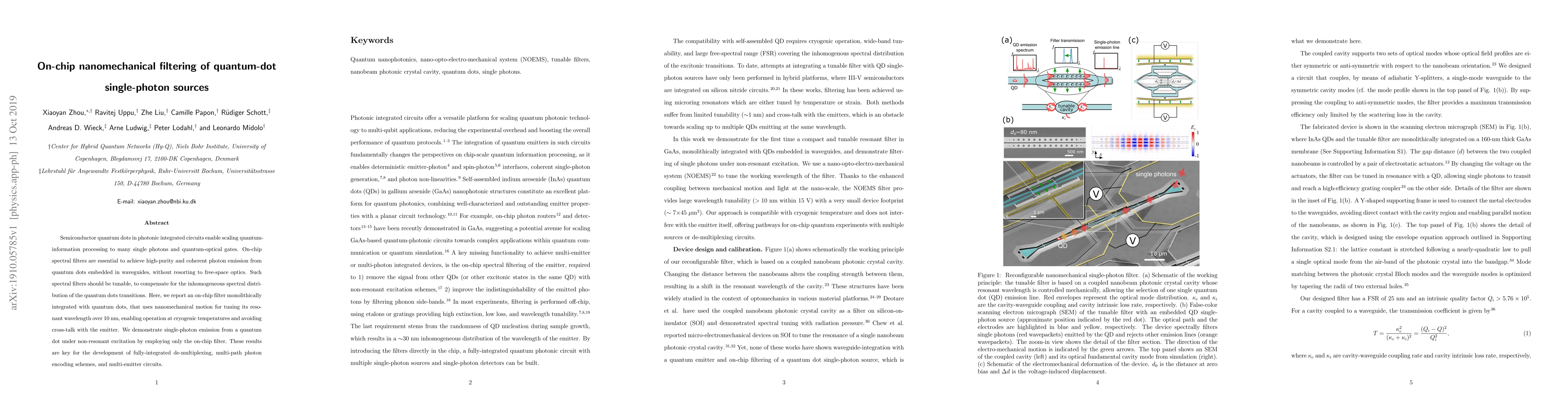This paper reports an on-chip nanomechanical filter integrated with quantum dots for high-purity single-photon emission. The filter uses nanomechanical tuning to achieve spectral flexibility over 10 nm, enabling efficient quantum-information processing without free-space optics.
