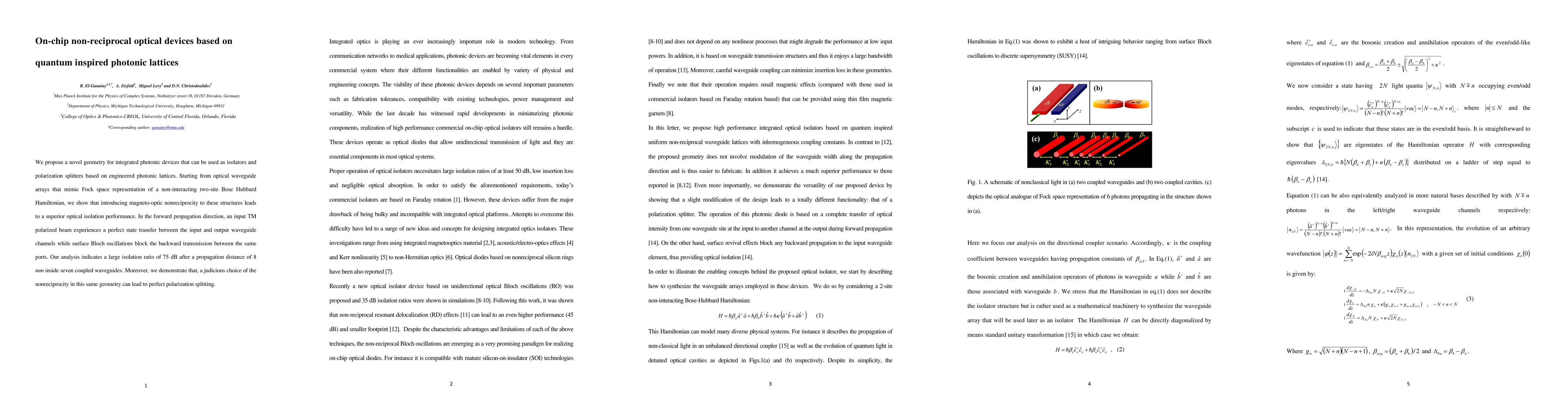 This paper proposes a novel photonic lattice geometry for integrated optical devices that functions as isolators and polarization splitters, leveraging quantum-inspired designs and magneto-optic nonreciprocity to achieve a high isolation ratio of 75 dB over 8 mm and perfect polarization splitting.