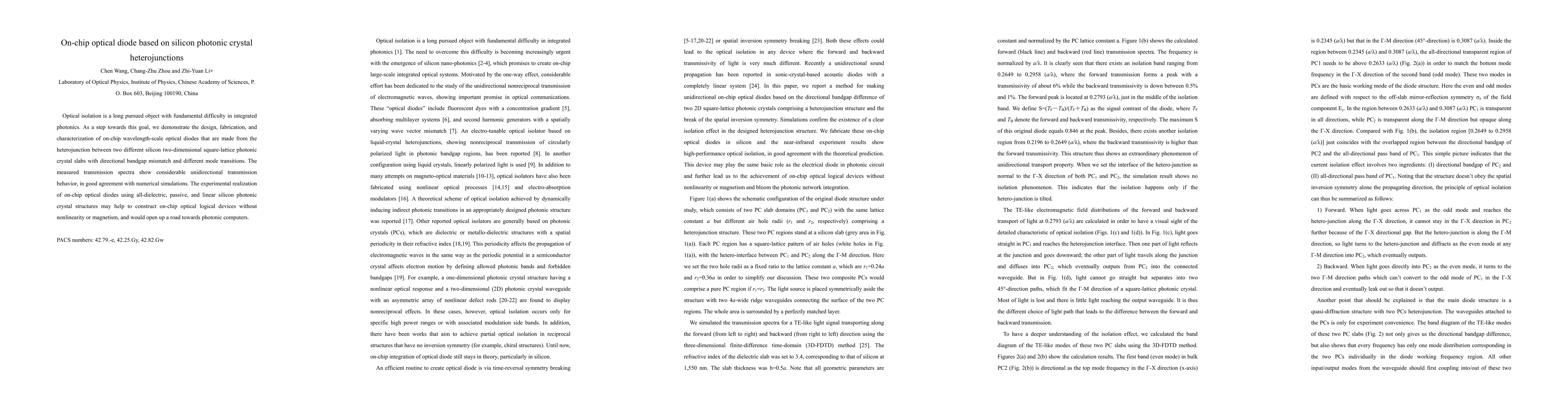 This research paper demonstrates the design and fabrication of on-chip optical diodes using silicon photonic crystal heterojunctions, achieving significant unidirectional transmission behavior that aligns with numerical simulations. This advancement in passive, all-dielectric optical components could facilitate the development of photonic logical devices and contribute to the future of photonic computing.