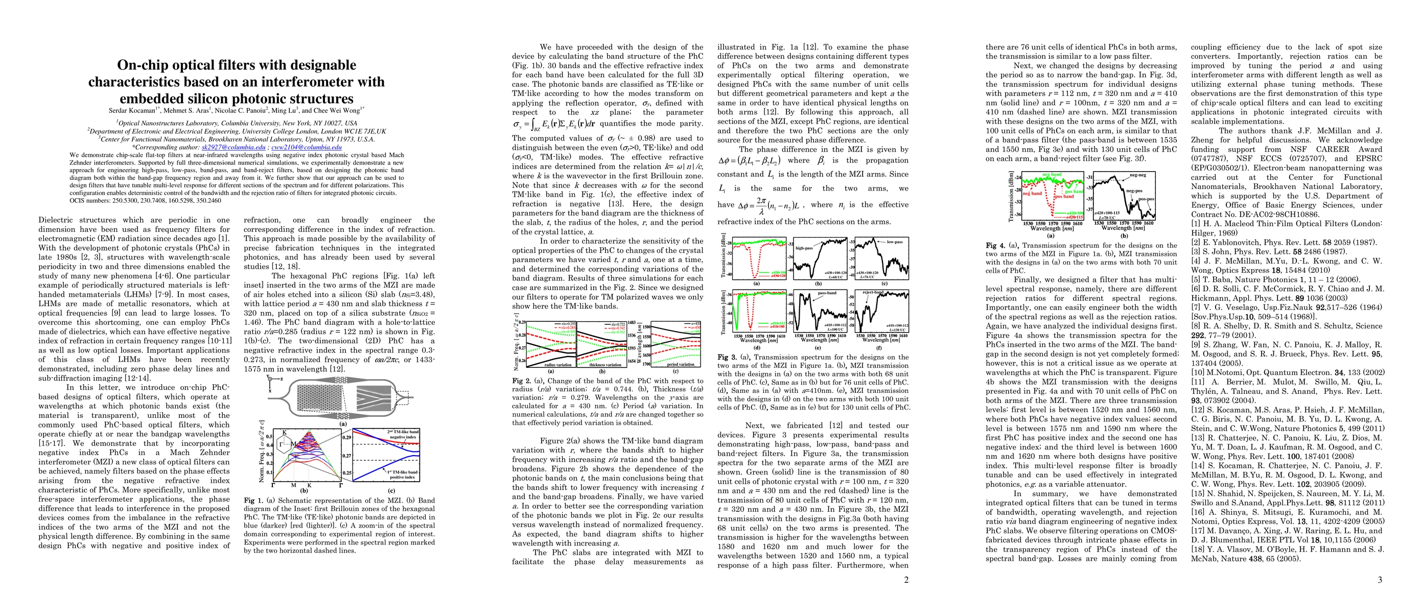 This paper presents on-chip optical filters utilizing negative index photonic crystal based Mach Zehnder interferometers, demonstrating flat-top filters at near-infrared wavelengths. The approach allows for engineering various filter types and tunable multi-level responses, enabling precise control over bandwidth and rejection ratio for integrated photonic circuits.