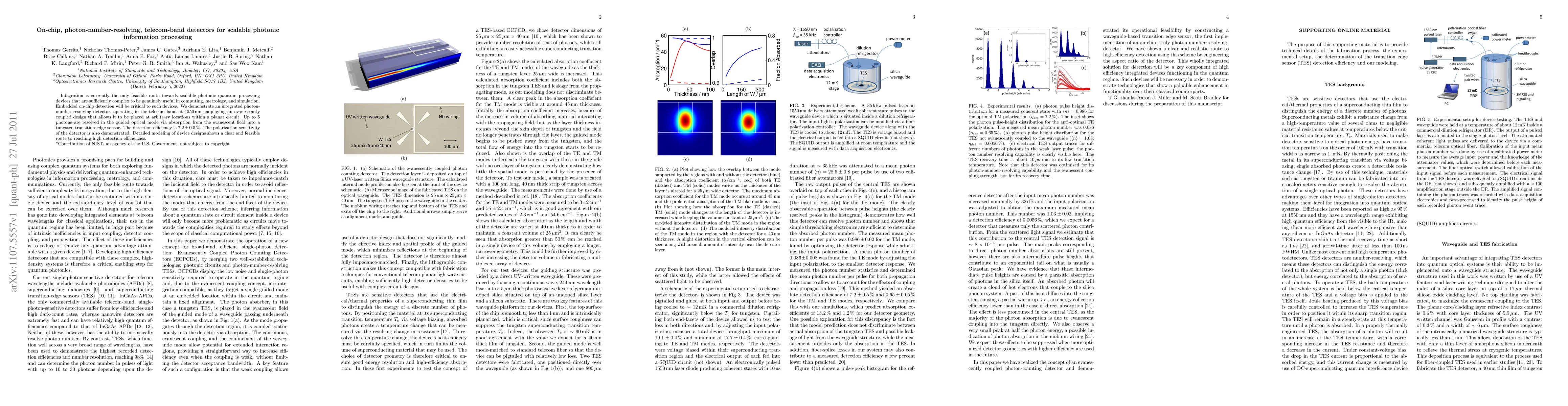 This paper presents an on-chip, photon-number-resolving detector for scalable photonic quantum processing, operating in the telecom band at 1550 nm. The detector employs an evanescently coupled tungsten transition-edge sensor, achieving up to 5 photon resolution with a detection efficiency of 7.2 ± 0.5%.