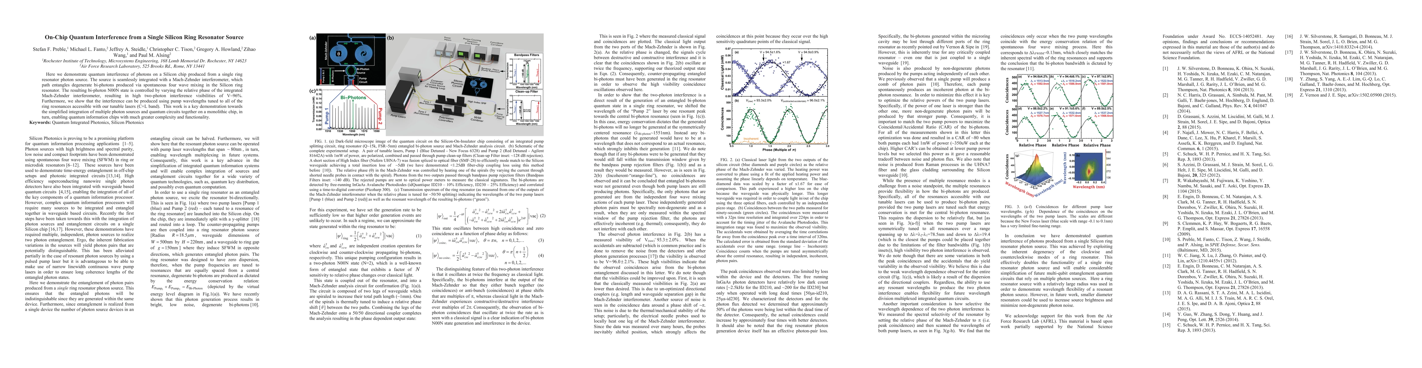 This paper demonstrates quantum interference of photons from a single silicon ring resonator integrated with a Mach-Zehnder interferometer, achieving high two-photon interference visibilities of ~96%. The work paves the way for the integration of multiple photon sources and quantum circuits on a monolithic chip, enhancing quantum information technology.