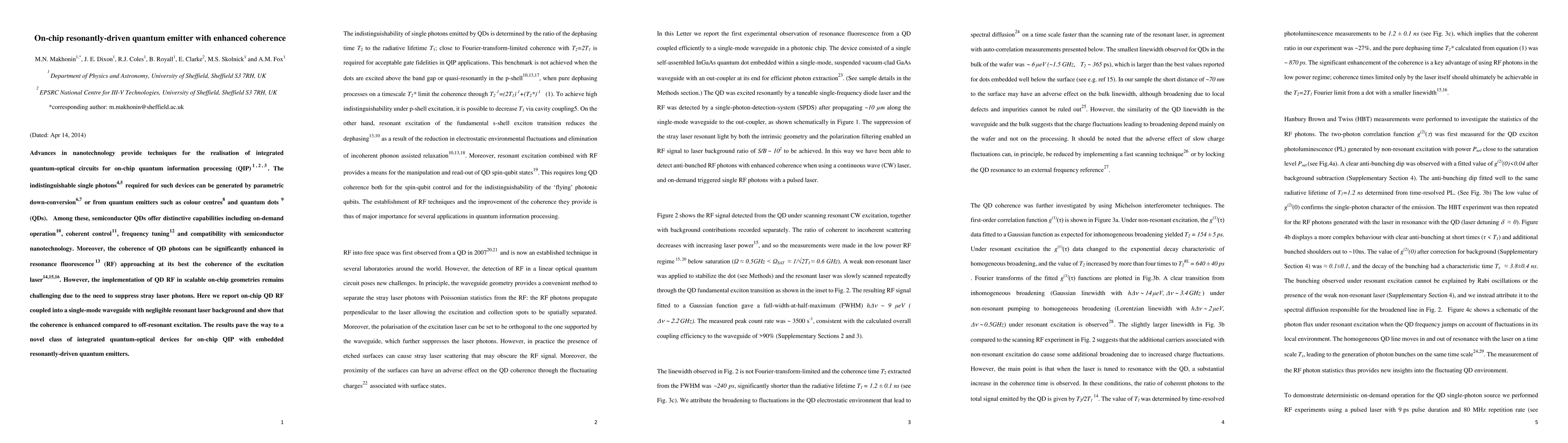This research develops an on-chip resonantly-driven quantum emitter using semiconductor quantum dots (QDs) to enhance photon coherence in integrated quantum-optical circuits, achieving negligible resonant laser background and superior coherence compared to off-resonant excitation. This advancement facilitates scalable on-chip quantum information processing (QIP) devices.