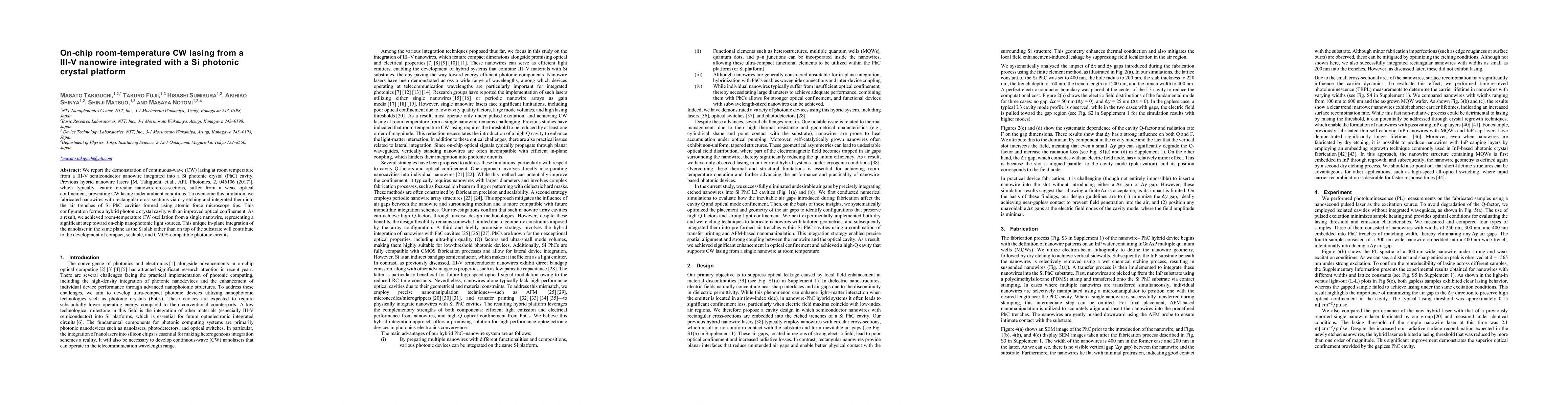 This study presents the first demonstration of on-chip room-temperature CW lasing from a III-V nanowire integrated with a Si photonic crystal, leveraging AFM-based nanowire positioning and advanced optical characterization techniques.