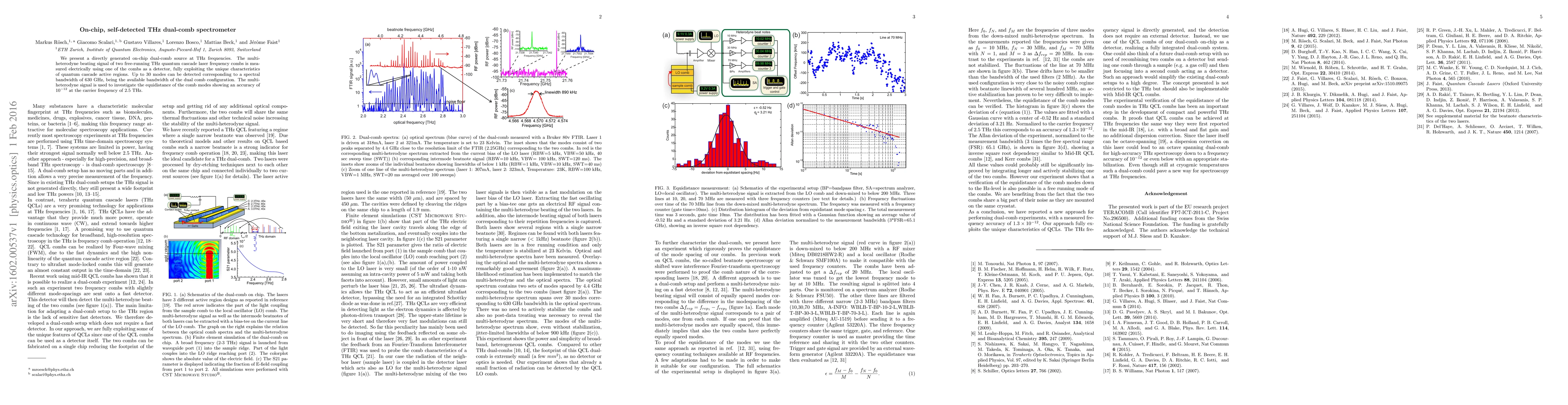 The paper introduces an on-chip THz dual-comb spectrometer with self-detection capability using two free-running THz quantum cascade laser frequency combs, demonstrating up to 30 mode detections over a 630 GHz bandwidth and achieving an equidistance accuracy of $10^{-12}$ at 2.5 THz.