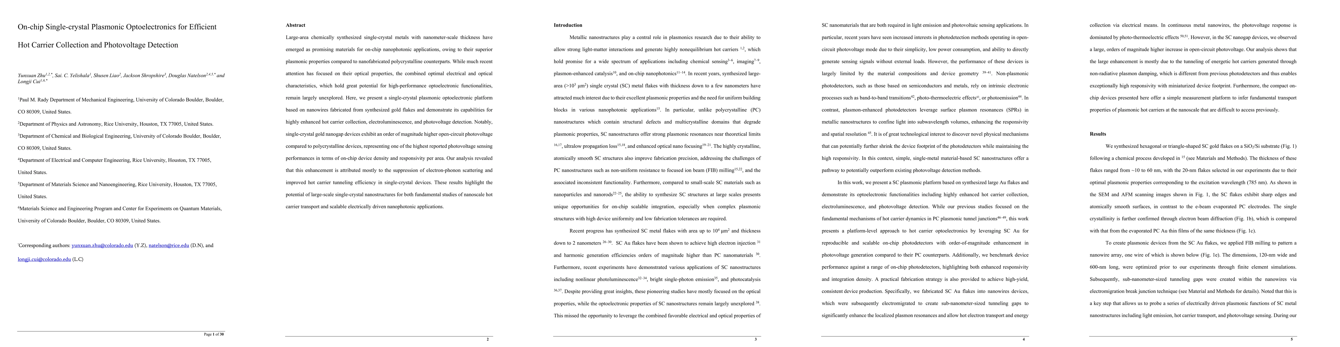 The study presents a single-crystal plasmonic optoelectronic platform based on gold nanowires, demonstrating capabilities for highly enhanced hot carrier collection, electroluminescence, and photovoltage detection.