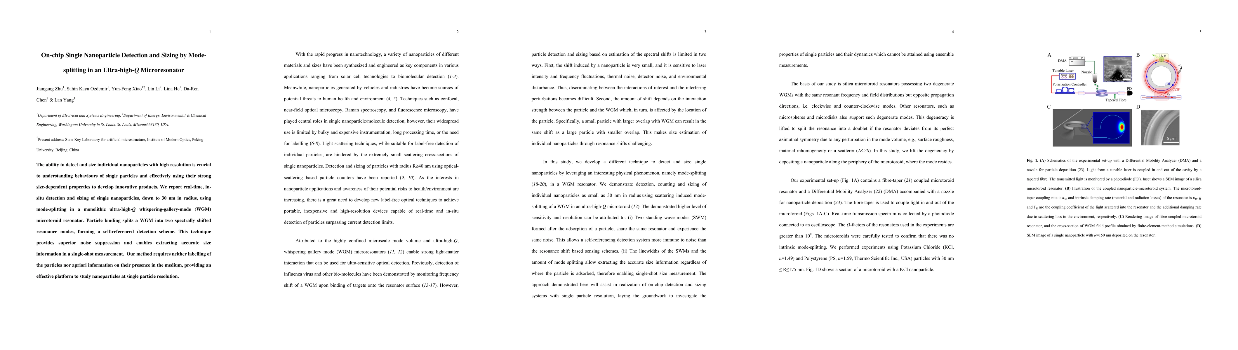This paper presents a method for real-time, in-situ detection and sizing of single nanoparticles down to 30 nm using mode-splitting in an ultra-high-Q microresonator. The technique leverages whispering-gallery-mode microtoroid resonators, offering superior noise suppression and accurate size information without requiring particle labelling.