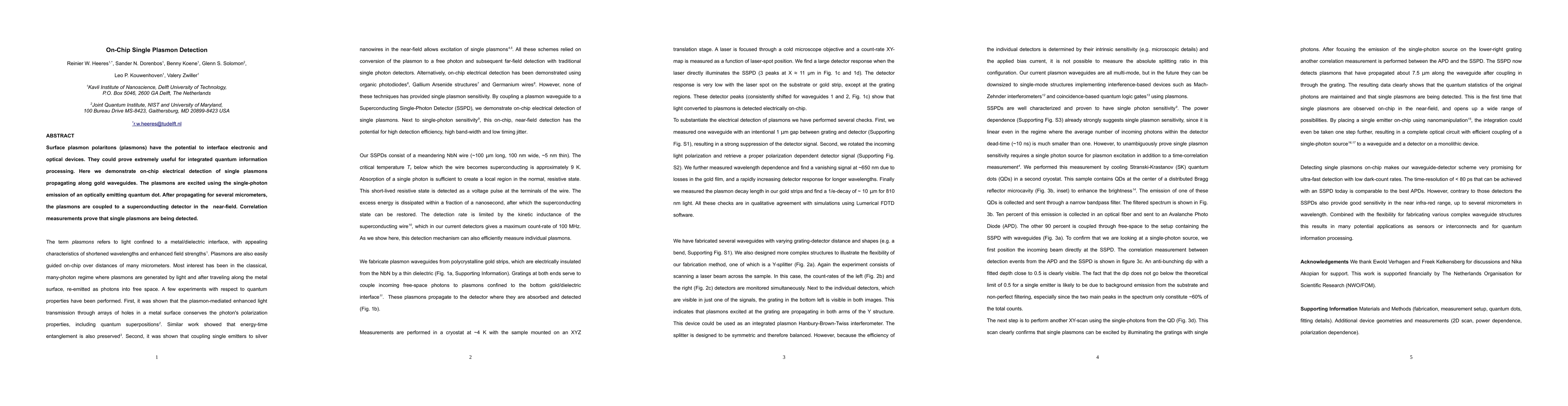 This study demonstrates on-chip electrical detection of single surface plasmons along gold waveguides, excited by a single-photon emitting quantum dot, and coupled to a superconducting detector, confirming the detection of individual plasmons through correlation measurements.