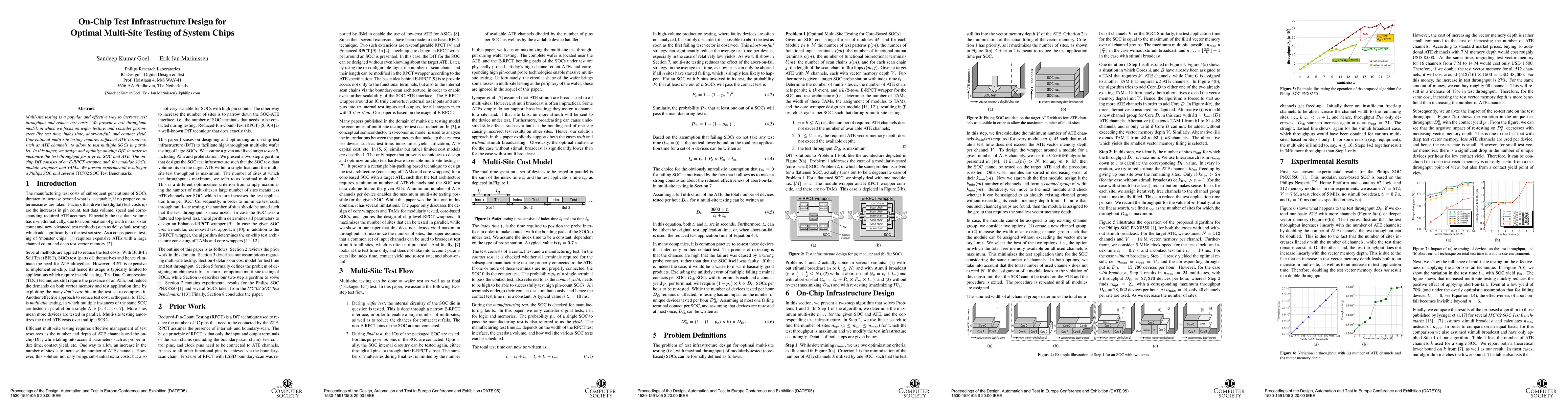 Multi-site testing is a popular and effective way to increase test throughput and reduce test costs. We present a test throughput model, in which we focus on wafer testing, and consider parameters like test time, index time, abort-on-fail, and contact yield. Conventional multi-site testing requires sufficient ATE resources, such as ATE channels, to allow to test multiple SOCs in parallel. In this paper, we design and optimize on-chip DfT, in order to maximize the test throughput for a given SOC and ATE. The on-chip DfT consists of an E-RPCT wrapper, and, for modular SOCs, module wrappers and TAMs. We present experimental results for a Philips SOC and several ITC'02 SOC Test Benchmarks.