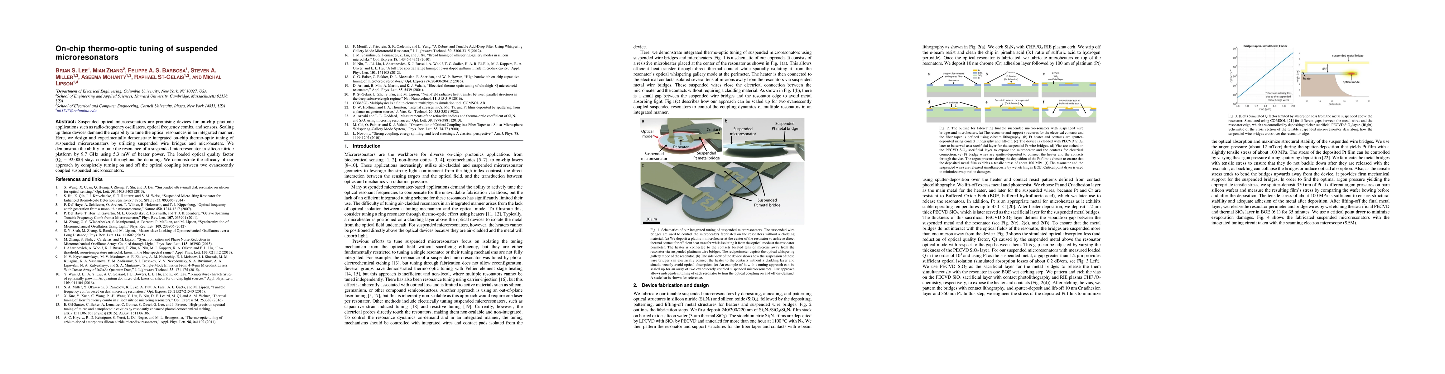 This paper presents an integrated on-chip thermo-optic tuning method for suspended microresonators using microheaters, achieving a resonance tuning of 9.7 GHz with minimal power (5.3 mW) while maintaining a high optical quality factor (~92,000). The technique enables full control of optical coupling between coupled microresonators.