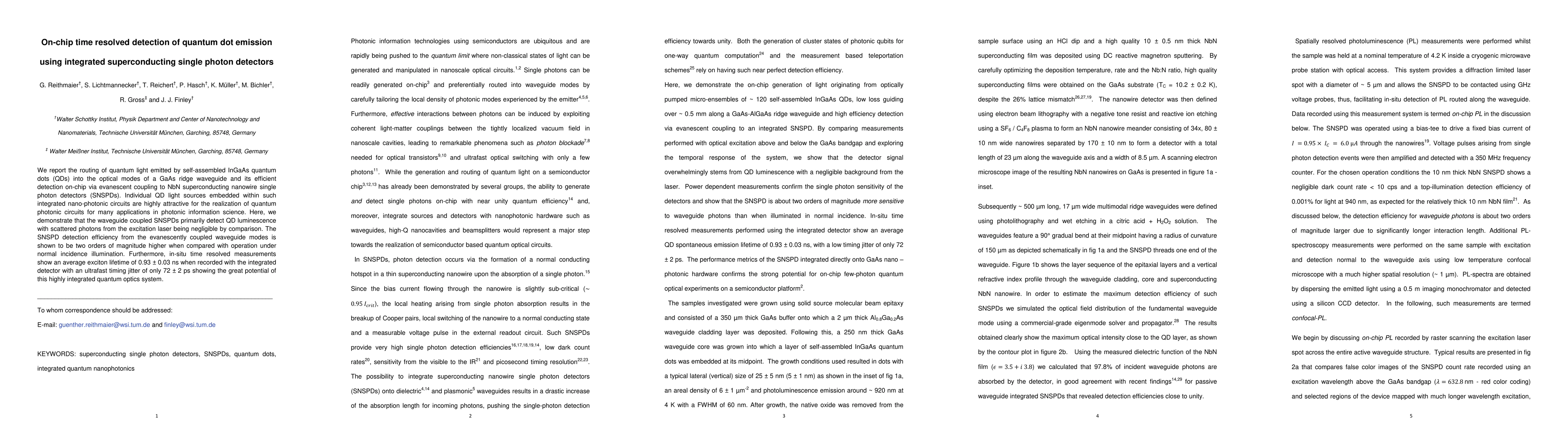 Researchers successfully detect quantum dot emission on a chip using integrated superconducting single photon detectors, achieving higher detection efficiency than normal incidence illumination.