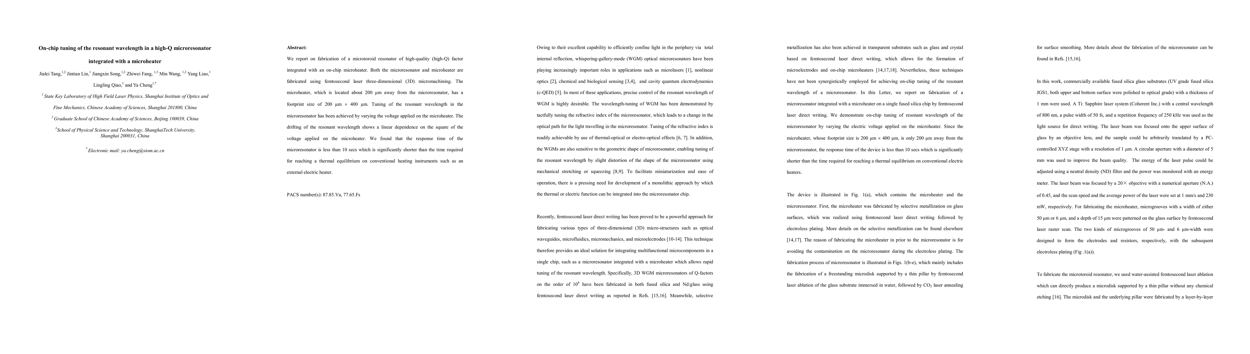 This paper details the fabrication of a high-Q microtoroid resonator integrated with an on-chip microheater using femtosecond laser 3D micromachining, enabling rapid on-chip tuning of the resonator's resonant wavelength via applied voltage, with a response time under 10 seconds.