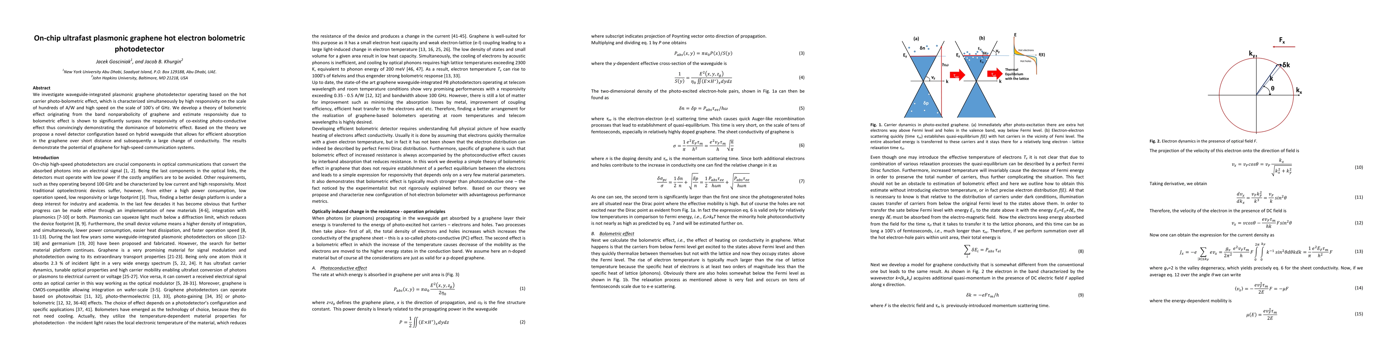 We investigate waveguide-integrated plasmonic graphene photodetector operating based on the hot carrier photo-bolometric effect, which is characterized simultaneously by high responsivity on the scale of hundreds of AW-1 and high speed on the scale of 100s of GHz. We develop a theory of bolometric effect originating from the band nonparabolicity of graphene and estimate responsivity due to bolometric effect is shown to significantly surpass the responsivity of co-existing photo-conductive effect thus convincingly demonstrating the dominance of bolometric effect. Based on the theory we propose a novel detector configuration based on hybrid waveguide that allows for efficient absorption in the graphene over short distance and subsequently a large change of conductivity. The results demonstrate the potential of graphene for high-speed communication systems.