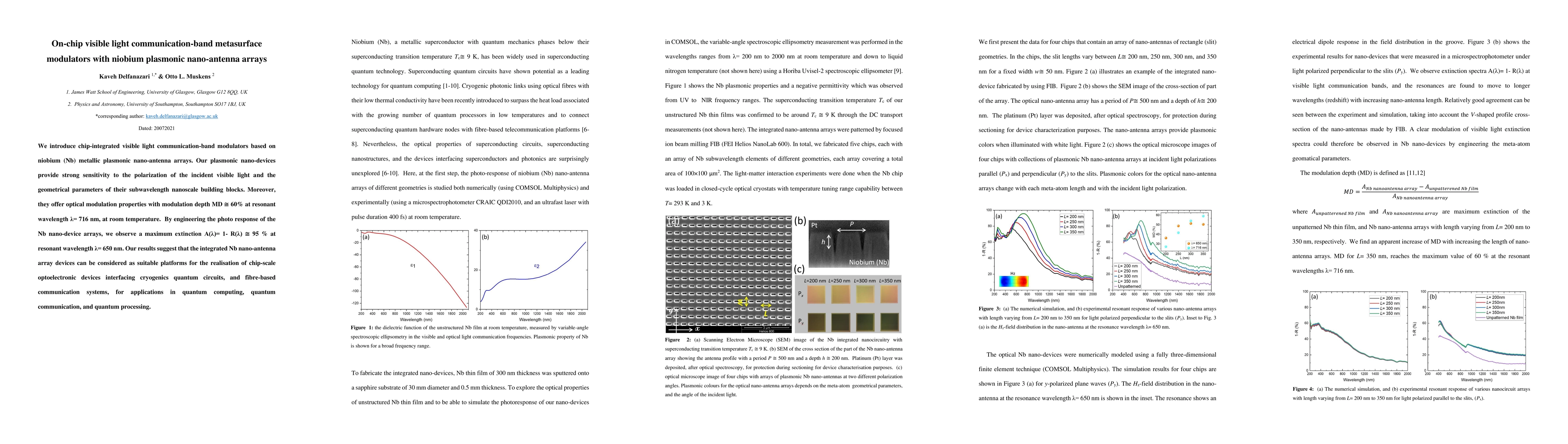 This paper presents chip-integrated visible light communication modulators based on niobium plasmonic nano-antenna arrays, achieving high modulation depth and extinction ratios. The engineered Nb nano-devices show promise for quantum computing and communication applications.