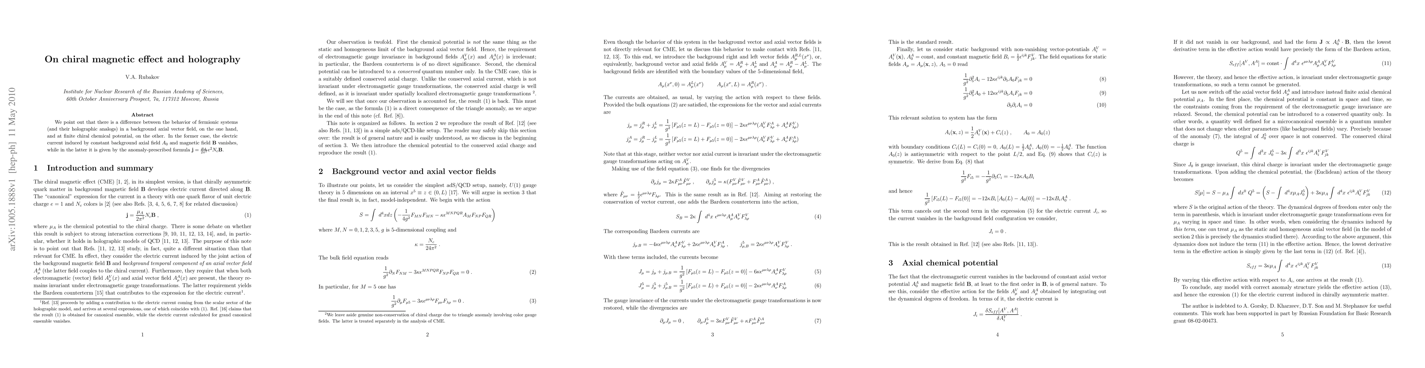 We point out that there is a difference between the behavior of fermionic systems (and their holographic analogs) in a background axial vector field, on the one hand, and at finite chiral chemical potential, on the other. In the former case, the electric current induced by constant background axial field $A_0$ and magnetic field ${\bf B}$ vanishes, while in the latter it is given by the anomaly-prescribed formula ${\bf j} = \frac{\mu_A}{2\pi^2}e^2 N_c {\bf B}$.