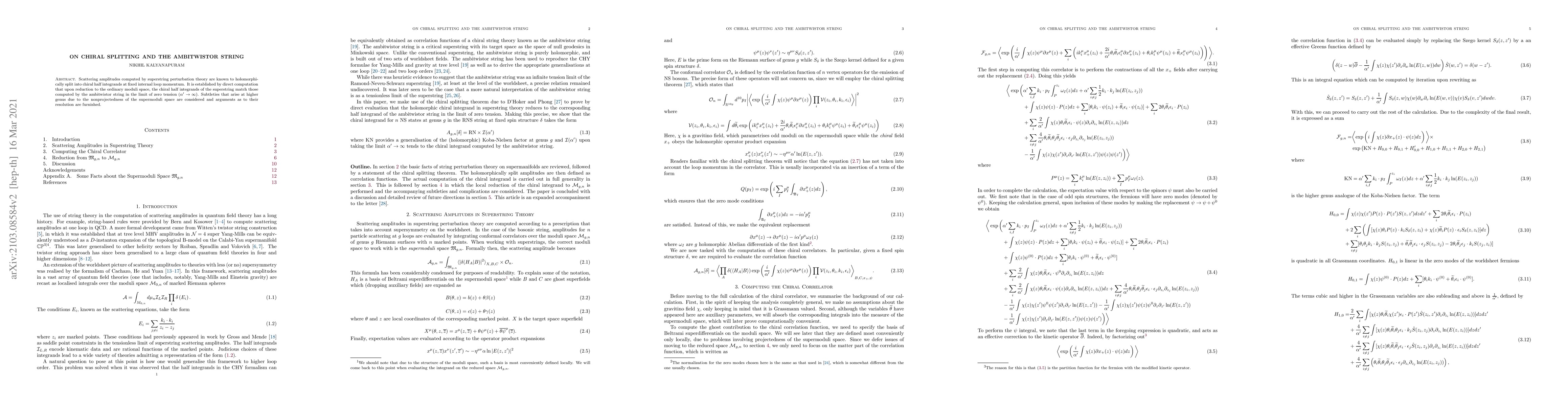 This paper establishes that superstring scattering amplitudes split into chiral half integrands, matching those from ambitwistor string computations at high genus and zero tension. It addresses complexities from the nonprojected supermoduli space and provides resolutions.