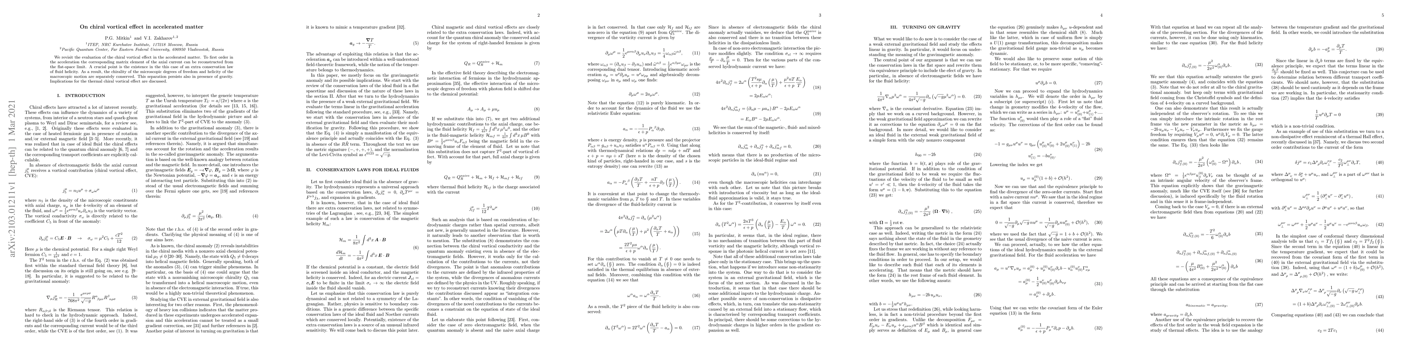 The paper revisits the chiral vortical effect in accelerated matter, showing that the axial current matrix element can be reconstructed from the flat-space limit to first order in acceleration. It highlights an additional conservation law of fluid helicity, maintaining separate conservation of chirality and helicity even in gravitational contexts.