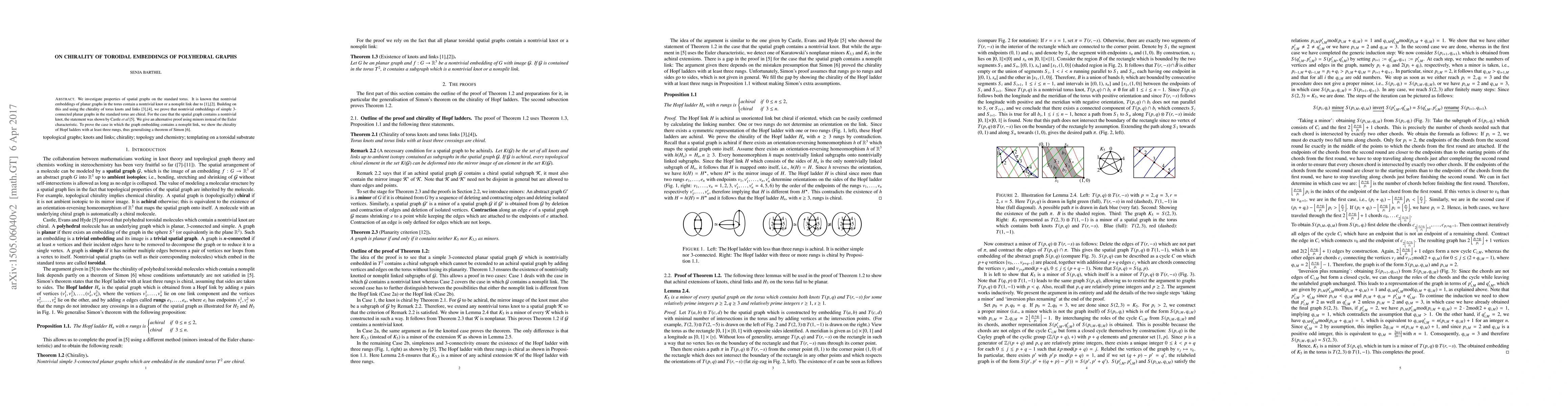 Researchers prove that nontrivial embeddings of simple 3-connected planar graphs in the torus are always chiral, and generalize a theorem on Hopf ladders with at least three rungs.